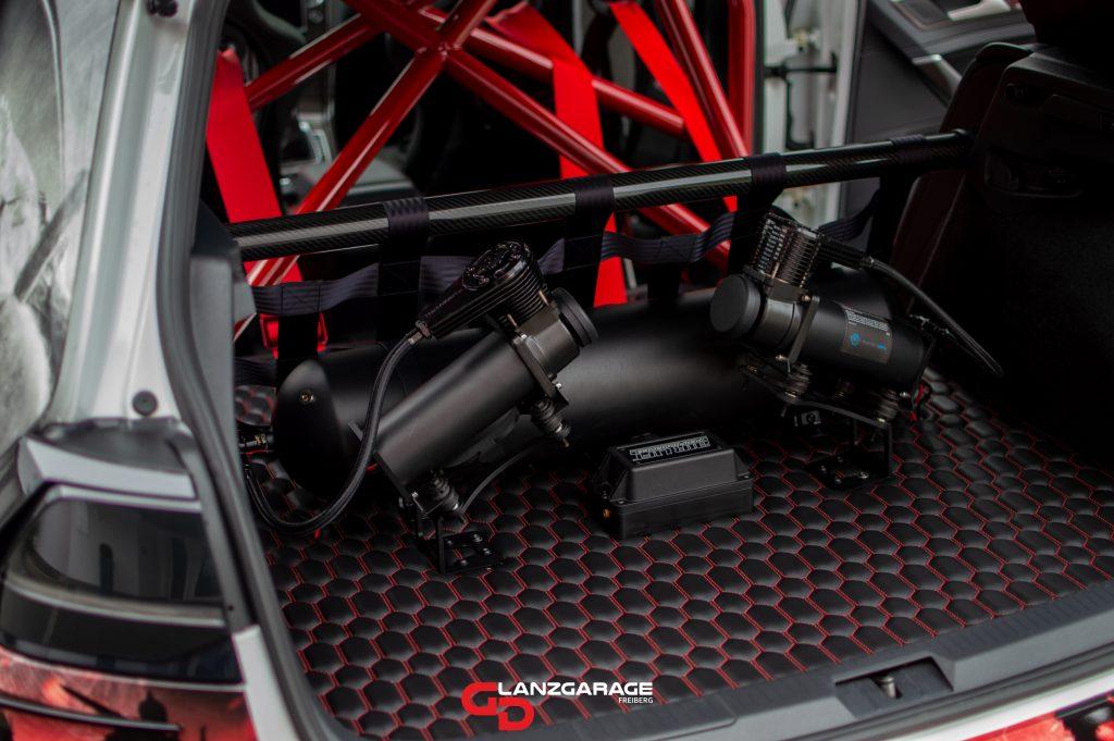 Außen ist, bis auf die neue Voll-Folierung, so ziemlich alles beim Alten – warum sollte man Bewährtes ändern ? Im Innenraum hat sich dafür über die Jahre so einiges getan ? 🤷🏻‍♂️😂 Neben Recaro Vollschalen, gibt es einen beleuchteten Sternenhimmel, einen unzählige Male verstrebten Käfig, mächtig viel und mehrfarbiges Carbon wohin man auch schaut, belederte oder lackierte Teile. Im Kofferraum thront der Luftkessel neben zwei Kompressoren und der airlift-Steuerung für das neue KW Luftfahrwerk. Alles im allen ein, wie ich finde, stimmiges Konzept mit Komponenten, die ihresgleichen Suchen.