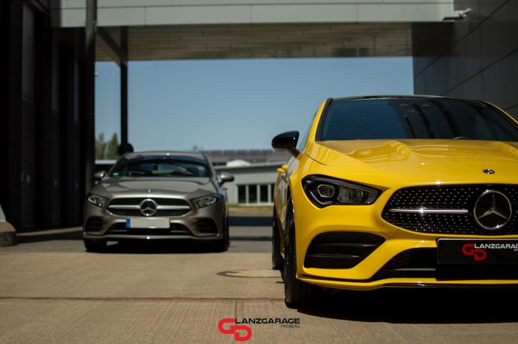 Achtung, Sonnenbrillenpflicht…hieß es bei der Fahrzeugübergabe. Die Mittagssonne brannte gleißend am Himmel und es war sehr schwierig das gelb mit der Kamera einzufangen. Sonne, Schatten, wieder zurück in die Sonne und noch einmal ab in Schatten…es war ein ständiges hin und herfahren um den CLA und später beide Fahrzeuge zu fotografieren. Der Klassiker bei solch einem gleissenden Licht und dem extrem knalligem gelb…im Augenlicht sieht manches irgendwie besser aus, als später auf dem Display der Kamera. Aber ich denke auch hier sprechen die Bilder wieder für sich.