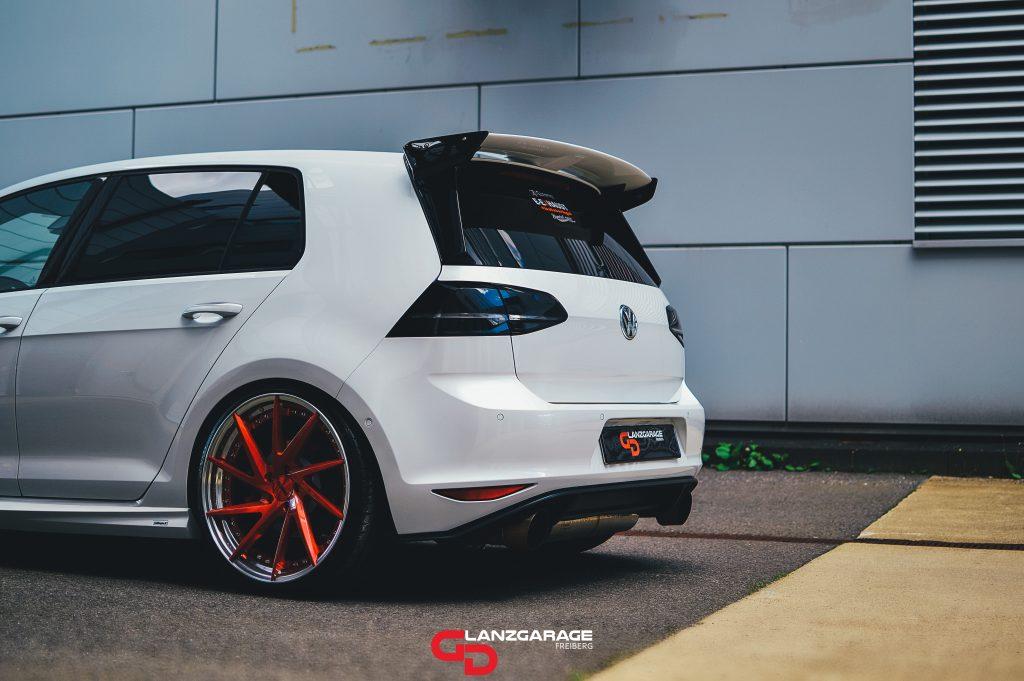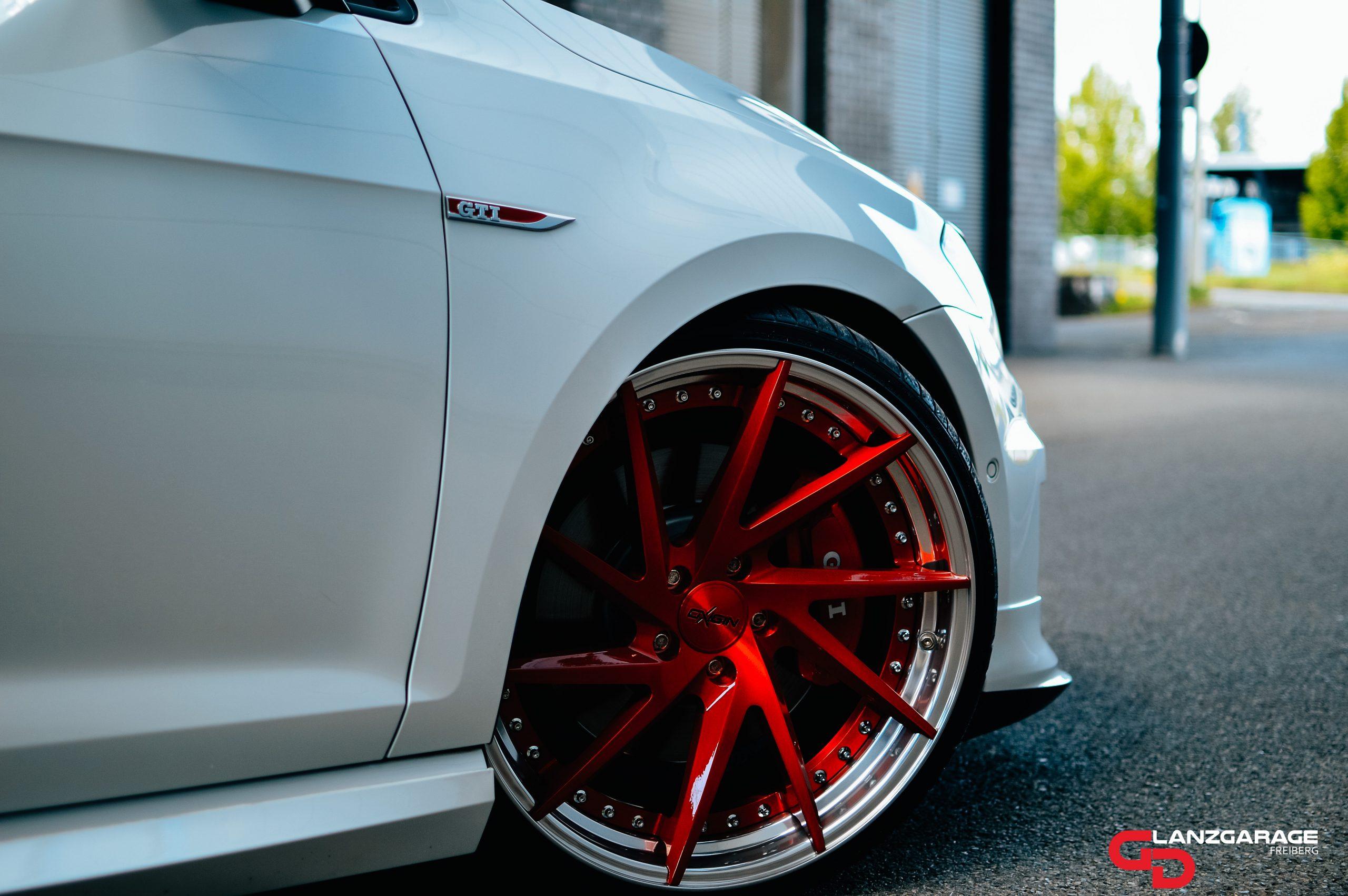 Aber zurück zum eigentlichen Anliegen…der Golf…Zustand war eher so naja durch den Vorbesitzer…das sieht man auch einem weißen Farbton irgendwann an. Also hieß es mehrstufig die Sache wieder ins richtige Glanzbild rücken. Vorher habe ich noch den oettinger Heckflügel teilweise zerlegt um alles polieren und versiegeln zu können. Bleiben wir gleich mal beim versiegeln, treu dem Motto darf es bisschen mehr sein gönnte Alexander seinem Heiligtum einmal alles, Ultima Keramik für den glitzernden Lack, Felgenversiegelung für die 20“ Candy lasierten Sterne und Edelstahl Betten und zum Schluss die Glasflächen inkl. Panoramadach natürlich. Der sehr gepflegte Innenraum bedarf hingegen nur einer kleinen kurzen und knackigen Innenreinigung. Das die Freude bei Abholung riesig war, brauch ich nicht erwähnen oder…!? Alexander war happy happy happy und ich freue mich immer wieder mindestens genauso sehr mit.